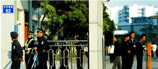 工人們聚集在廠門口、文華南路,或坐或站,沒有過激言行。停工行為引來大批警力,下午3時(shí)許,包括治安民警、公安特警等數(shù)十警員荷槍實(shí)彈在現(xiàn)場警戒,公司廠區(qū)一座二樓的樓頂也設(shè)置了崗哨。