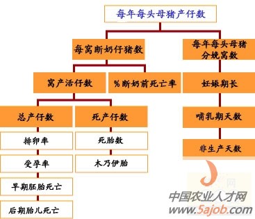 衡量母豬群繁殖性能最常用的指標是“斷奶仔豬數(shù)/母豬/年”(PSY)。這個指標又是由“分娩窩數(shù)/母豬/年”和“斷奶仔豬數(shù)/窩”兩個指標所決定,這兩個指標是同等重要的(圖1)。許多因素會影響活產(chǎn)仔數(shù)(圖2),本文中,我們討論了影響活產(chǎn)仔數(shù)的這些因素。