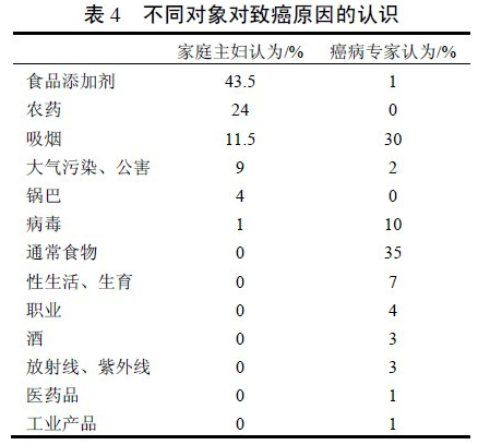 表4 即為聯(lián)合國(guó)衛(wèi)生組織(WHO)在全球范圍內(nèi)針對(duì)各種物質(zhì)和行為向不同對(duì)象隨機(jī)抽樣調(diào)查的結(jié)果。由表 4 可見,對(duì)于市售農(nóng)藥,有24%被調(diào)查家庭主婦認(rèn)為會(huì)致癌,而所有癌病專家則認(rèn)為農(nóng)藥不會(huì)致癌。這是由于一旦發(fā)現(xiàn)某農(nóng)藥會(huì)有“三致”危險(xiǎn),則立即被禁止使用,馬上從市場(chǎng)中清理。故而,認(rèn)為農(nóng)藥會(huì)“致癌”完全是錯(cuò)誤的。