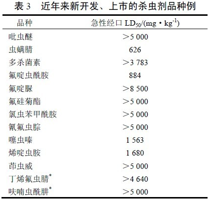 然而,近年來(lái)新開發(fā)、上市的農(nóng)藥毒性均比較低。表3 即為近年來(lái)上市的殺蟲劑品種的急性經(jīng)口毒性,其中絕大多數(shù)品種均屬低毒或微毒。目前,這些殺蟲劑正逐步取代一些傳統(tǒng)的殺蟲劑,成為殺蟲劑市場(chǎng)的主體。而人們常用的食鹽,其LD50 為3 000~4000 mg/kg,人們每天必用的牙膏則為250 mg/kg。就急性經(jīng)口毒性而言,它們的毒性遠(yuǎn)高于當(dāng)前使用的一些新穎農(nóng)藥。