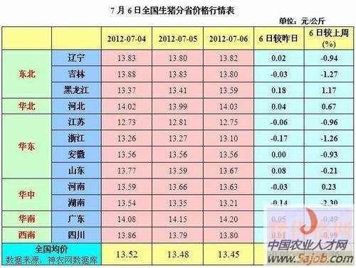 2012年7月7日全國生豬分省價(jià)格行情分析:13.45元/公斤(注:外三元、內(nèi)三元、土雜豬均價(jià)得出的平均價(jià)格),較昨日生豬均價(jià)下跌0.03元/公斤,比上周均價(jià)下降0.86%。從地區(qū)來看,今日東北地區(qū)豬價(jià)整體穩(wěn)中有升,黑龍江豬價(jià)小幅回升;華北地區(qū)河北豬價(jià)微幅上漲;華東地區(qū)豬價(jià)漲跌互現(xiàn),江蘇、浙江價(jià)格小幅下跌,山東小幅上漲,安徽價(jià)格持平;華中地區(qū)豬價(jià)小幅下跌;華南地區(qū)廣東豬價(jià)小幅回升;西南地區(qū)四川豬價(jià)持穩(wěn)。