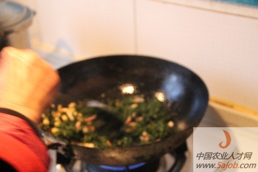 為了讓蒿子粑營(yíng)養(yǎng)均衡、更好吃有香味,切一些自己腌制的咸肉放入鍋中炸,等到油出來(lái)差不多了,將切好的蒿子倒入鍋中翻炒片2分鐘。