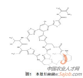 那西肽又名諾西肽、諾肽菌素和諾肽霉素,是一種帶有5個噻唑環(huán)的多肽類抗生素,其分子式為C15H43N13O12S6,分子量為1222,其結構如圖1所示。