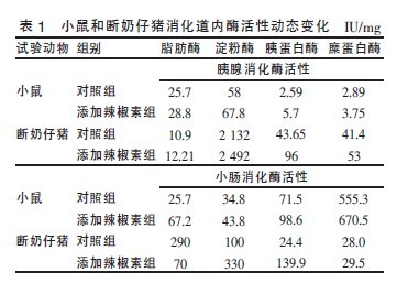 陳忠法等(2001)試驗(yàn)選用21 日齡左右杜大長(zhǎng)仔豬160 只,試驗(yàn)組喂日糧基礎(chǔ)+0.1%辣椒粉,結(jié)果表明辣椒粉具有促進(jìn)仔豬生長(zhǎng)發(fā)育,提高飼料利用率的作用。畜牧人才網(wǎng)專家?guī)祚R黎明等(2006)在仔豬日糧中適當(dāng)添加辣椒粉,對(duì)仔豬有促進(jìn)生長(zhǎng)和提高飼料利用率的作用,0.3%、0.4%、0.5% 3 個(gè)水平的添加量都能產(chǎn)生一定的經(jīng)濟(jì)效益,但以0.4%的添加量為最好。Manzanilla 等(2009)發(fā)現(xiàn),含植物提取物(含辣椒提取物、香芹酚、肉桂醛)組可增加回腸乳酸桿菌: 腸桿菌比例和降低盲腸VFA 的產(chǎn)生。此外,科學(xué)家報(bào)道辣椒素可以增強(qiáng)動(dòng)物消化道內(nèi)酶的活性(表1)。