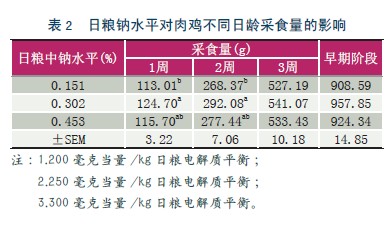 Na、Cl和K在維持正常的滲透壓和酸堿平衡、體組織的蛋白質(zhì)合成、細(xì)胞內(nèi)外的動(dòng)態(tài)平衡和細(xì)胞膜的電位方面有重要的作用。Bidar等研究發(fā)現(xiàn),從前兩周的飼喂來(lái)看,在早期日糧中添加0.3%的鈉處理組的采食量最大并且體增重最高(表2)。