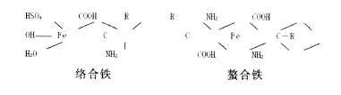 鐵元素與有機(jī)酸、氨基酸、小肽、蛋白質(zhì)和多糖衍生物等配位體(供體)通過離子鍵或共價(jià)鍵結(jié)合而成的絡(luò)合物(或螯合物)。絡(luò)合鐵通常是一個鐵元素與一個有機(jī)酸構(gòu)成的,它們之間以簡單的離子鍵相連,只有一個結(jié)合點(diǎn)。螯合鐵結(jié)構(gòu)比較復(fù)雜,它一般由一個鐵元素通過至少兩個鍵與一或兩個配位體構(gòu)成。例如,氨基酸螯合鐵中,鐵與兩個氨基酸形成4個鍵,其中兩個鍵是鐵與氧形成的離子鍵,結(jié)合力一般很弱,另外兩個是鐵與氮形成的共價(jià)鍵,結(jié)合力相對較強(qiáng)。螯合鐵也稱內(nèi)絡(luò)合鐵,由于它的環(huán)狀結(jié)構(gòu),通常比絡(luò)合鐵穩(wěn)定。鍵的類型和強(qiáng)度是影響絡(luò)合物穩(wěn)定性和生物利用率的重要因素。美國官方飼料監(jiān)測局(MFCO,1996)確定的有機(jī)鐵定義:對氨基酸和蛋白質(zhì)金屬螯合鐵,是指可溶性鹽的鐵離子同氨基酸按照1:1~3(最佳為1:2)的比例反應(yīng),生成配位的共價(jià)鍵所得產(chǎn)物。水解氨基酸的平均分子量為150,生成的螯合鐵分子量不得超過800。