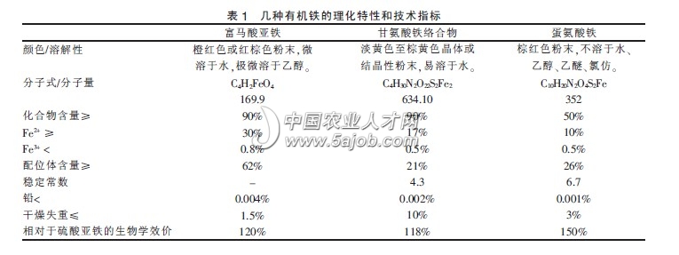 由于配位體不同,有機鐵的理化特性和技術(shù)指標(biāo)有所差異(表1)。