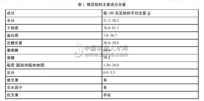 蜂花粉是由蜜蜂采集回巢的花粉,除含有一般花粉的營養(yǎng)成分外,還含有少量花蜜及其分泌物,外形為蜜蜂加工過的花粉團(tuán)。它不僅含有各種營養(yǎng)素,而且能保持各營養(yǎng)素之間的相互平衡。蜂花粉主要來源于蜜源植物和粉源植物。蜂花粉的來源不同,其營養(yǎng)價(jià)值也存在著較大差異。蜂花粉中富含蛋白質(zhì)、脂肪、碳水化合物、維生素及礦物質(zhì)。其中蛋白質(zhì)含量占到10%--40%。蜂花粉中富含18種氨基酸,蜂花粉的氨基酸不僅含量高,而且種類多,很少有其它食物能與其相比。一般蜂花粉所含營養(yǎng)成分如表1所示(蘇壽祁,2005)。除常規(guī)營養(yǎng)成分以外,蜂花粉中含酶類之多,可以說是自然界食品之最,據(jù)R.G.Stnaelg研究總結(jié),蜂花粉中富含100多種酶,如過氧化氫酶,過氧化物酶,超氧化物歧化酶(SOD)等,這些酶均具有抗氧化及抗自由基的作用,能調(diào)節(jié)有機(jī)體內(nèi)最重要的生化過程;ǚ鄣臓I養(yǎng)成分在性質(zhì)上屬于活性物質(zhì),易被動(dòng)物吸收和利用,因此量雖然很少,服用后產(chǎn)生的效果卻又快又好。另外,花粉中還富含黃酮類化合物(常見的有黃酮醇、山奈酚、楊梅黃酮、木犀黃酮、異鼠李素、原花青素等)、激素(花粉含有植物六大生長調(diào)節(jié)激素)、核酸(脫氧核糖核酸DNA和核糖核酸RNA)、有機(jī)酸及一些未知成分。已有實(shí)驗(yàn)證實(shí),花粉有植物激素性質(zhì)的化合物,也含有具有抗菌作用的物質(zhì)(Linskensetal.1997)。