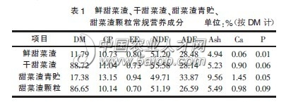 甜菜渣或稱甜菜粕,是甜菜在制糖過(guò)程中,經(jīng)切絲、滲出、充分提取糖分后含糖很少的菜絲,亦稱廢糖渣,是制糖工業(yè)的副產(chǎn)品。它具有柔軟多汁、營(yíng)養(yǎng)豐富、適口性強(qiáng)、消化率高和價(jià)格低廉等優(yōu)點(diǎn),是家畜良好的飼料。鮮甜菜渣、干甜菜渣、甜菜渣青貯、甜菜渣顆粒中的常規(guī)營(yíng)養(yǎng)成分含量見(jiàn)表1。 無(wú)論是鮮甜菜渣還是干甜菜渣,均含有較豐富的的營(yíng)養(yǎng)物質(zhì)。