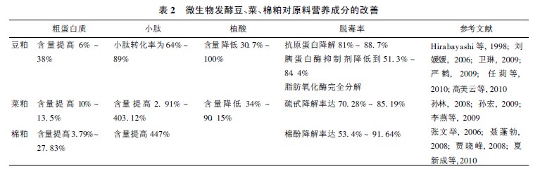 微生物發(fā)酵豆、菜、棉粕可以改變飼料原料的物理特性,改善適口性,提高蛋白質(zhì)含量,降低粗纖維含量,降解抗?fàn)I養(yǎng)因子和飼料毒素,從而提高動(dòng)物對(duì)飼料的消化利用率(表2)。
