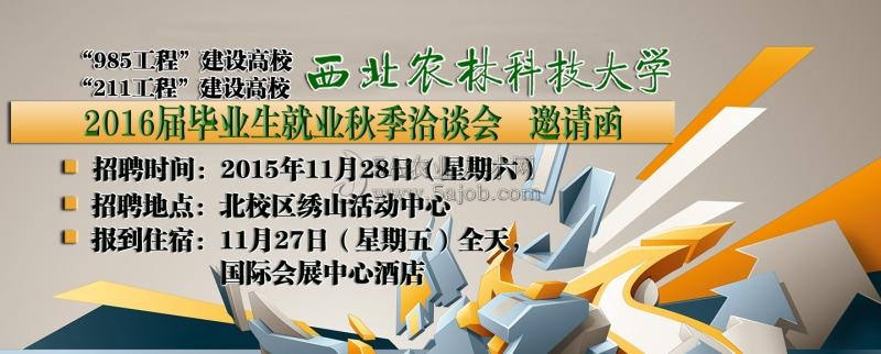 西北農(nóng)林科技大學(xué)是教育部直屬全國重點大學(xué),“985工程”、“211工程”建設(shè)高校,2016屆畢業(yè)生共有7500余名,其中畢業(yè)研究生2100余名,本科畢業(yè)生5400余名。為了幫助畢業(yè)生順利就業(yè),為貴單位選聘適用的畢業(yè)生提供方便,同時也更好地擴大貴單位影響,誠摯邀請貴單位參加我校2016屆畢業(yè)生就業(yè)秋季洽談會。